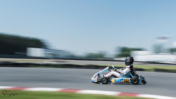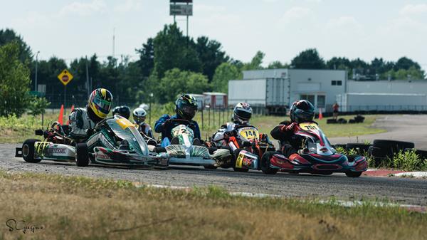 Résumé en bref des catégories. Pour la catégorie Briggs & Stratton Cadet, ce fut dominé par les deux mêmes jeunes pilotes ( Jade Wilson et Jackson Lachapelle ) qui s’échangeaient de position du début à la fin! Jade est présentement au premier rang du championnat avec 49 points suivi de près par Jackson avec 45 points. Donc, pour le podium ce fut: